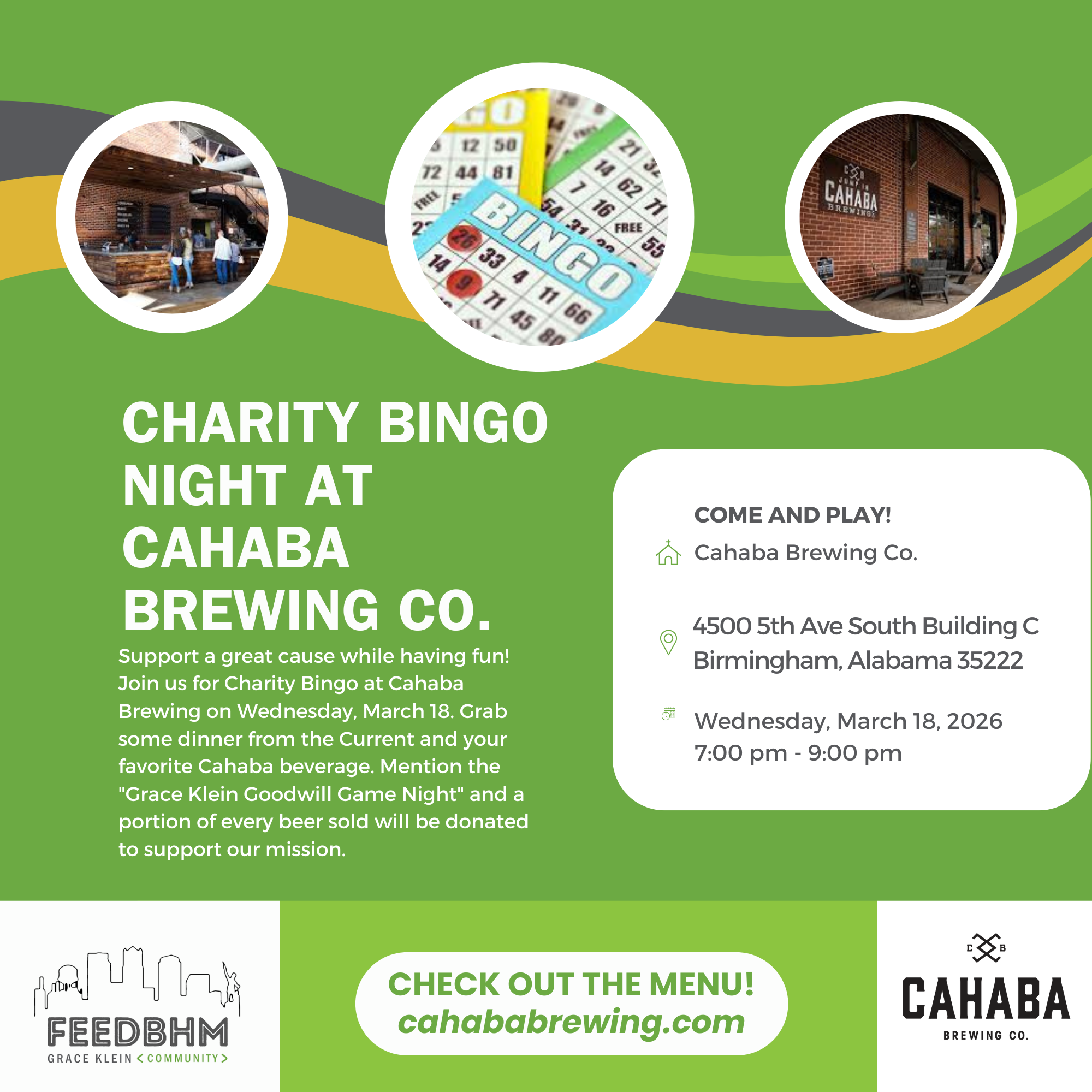 Support a great cause while having fun! Join us for Charity Bingo at Cahaba Brewing on Wednesday, March 18th. Grab some dinner from the Current and your favorite Cahaba beverage. Mention the "Grace Klein Goodwill Game Night" and a portion of every beer sold will be donated to support our mission.