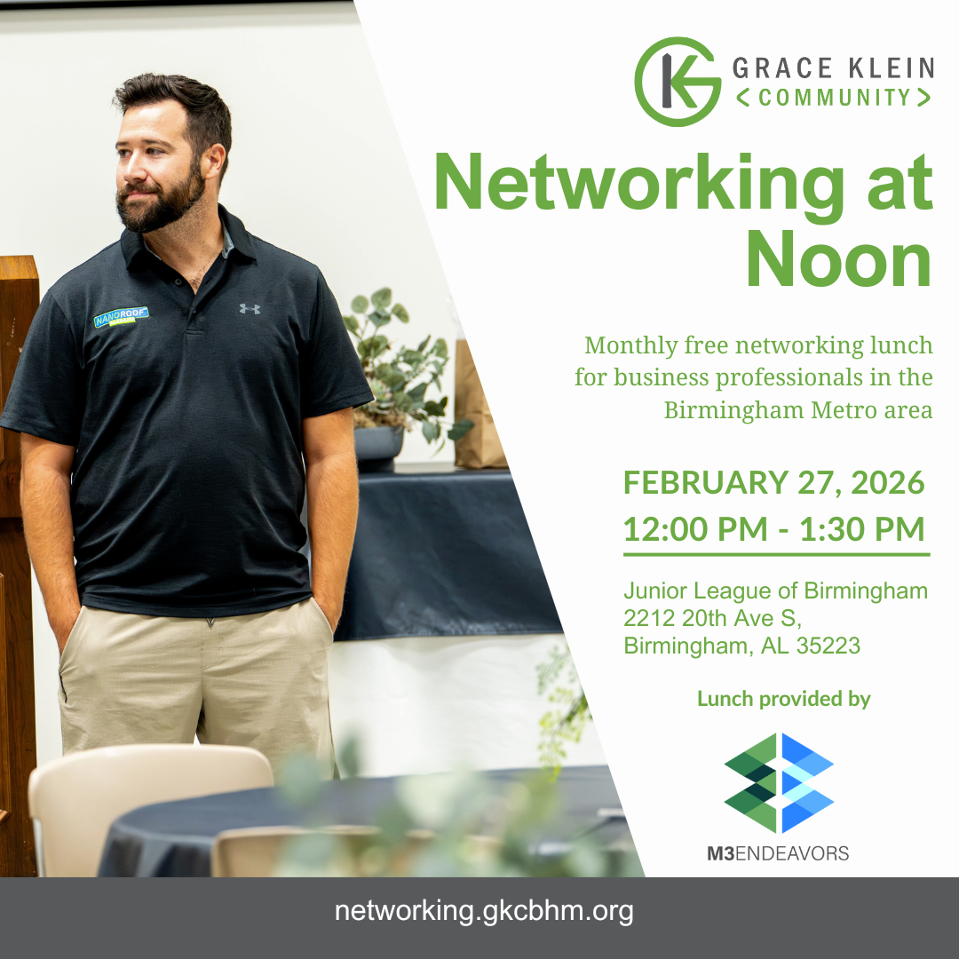You are invited to Grace Klein Community’s Networking at Noon Experience. 12:00 Lunch Provided 12:00 -12:15 Word of Encouragement to Business Professionals 12:20 – 1:00 Speed Networking – Each business professional will have the opportunity to introduce themselves and their business to all in attendance 1:00 -1:10 Door Prizes and Closing 1:10 – 1:30 Networking,… Read More »Networking at Noon Experience
