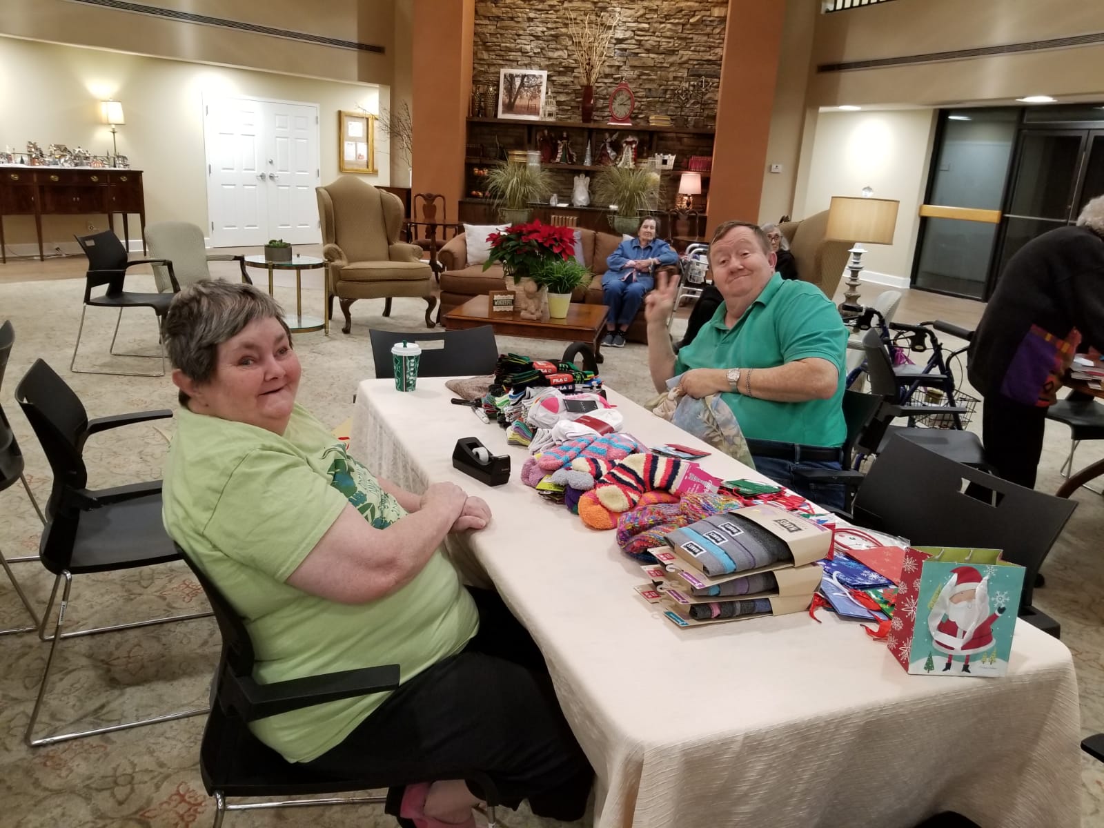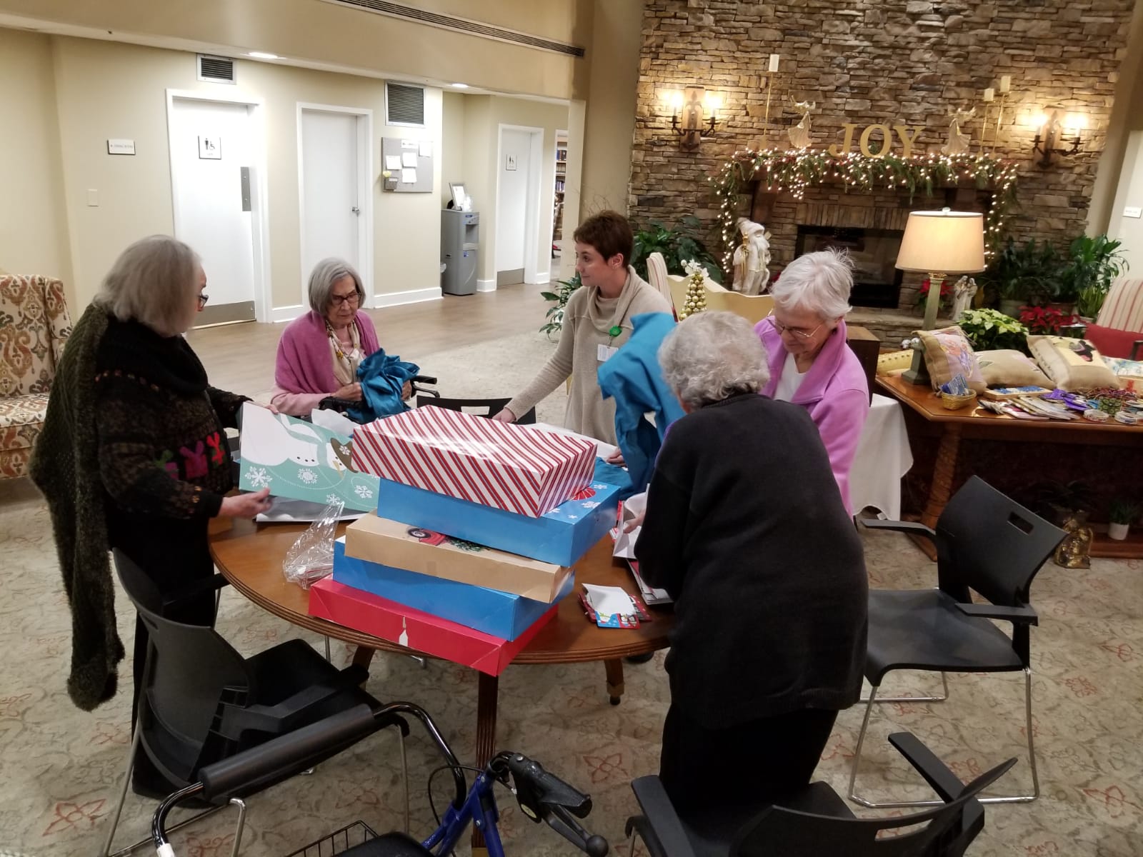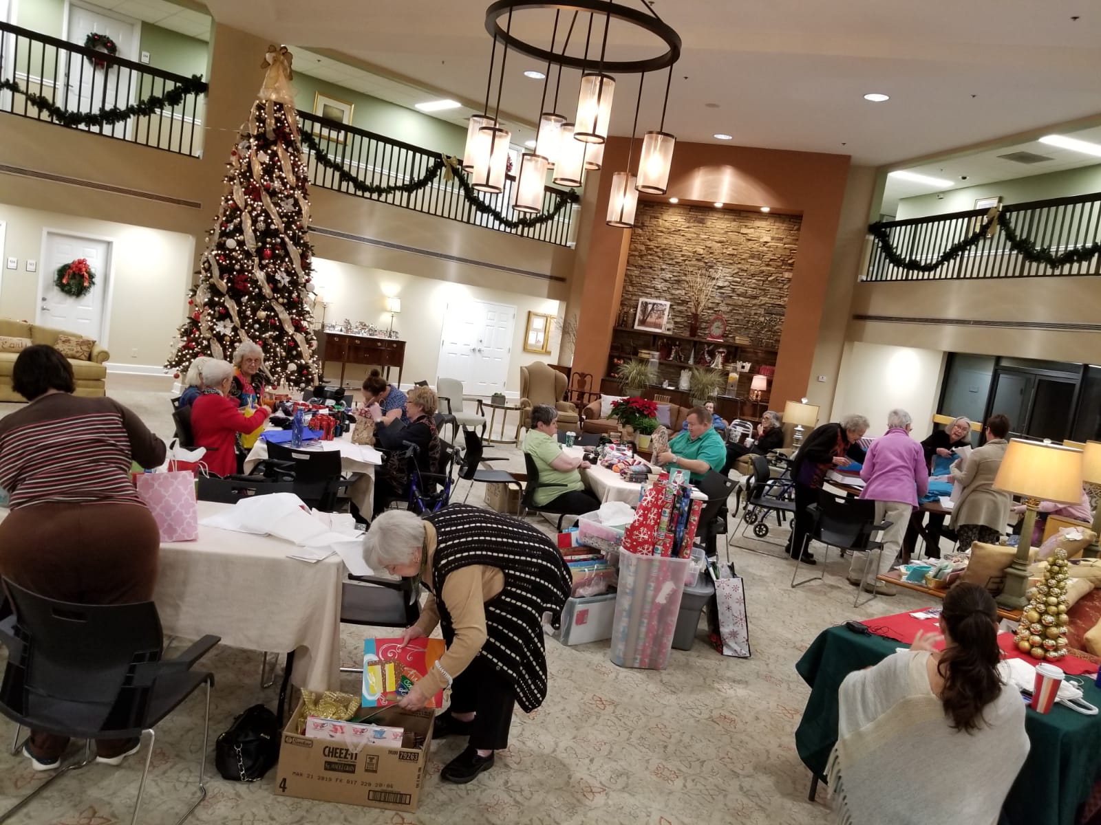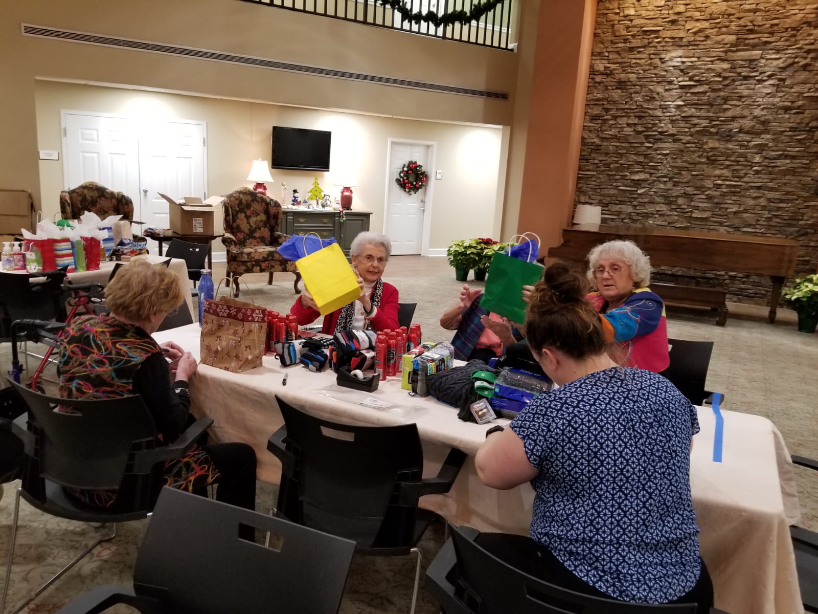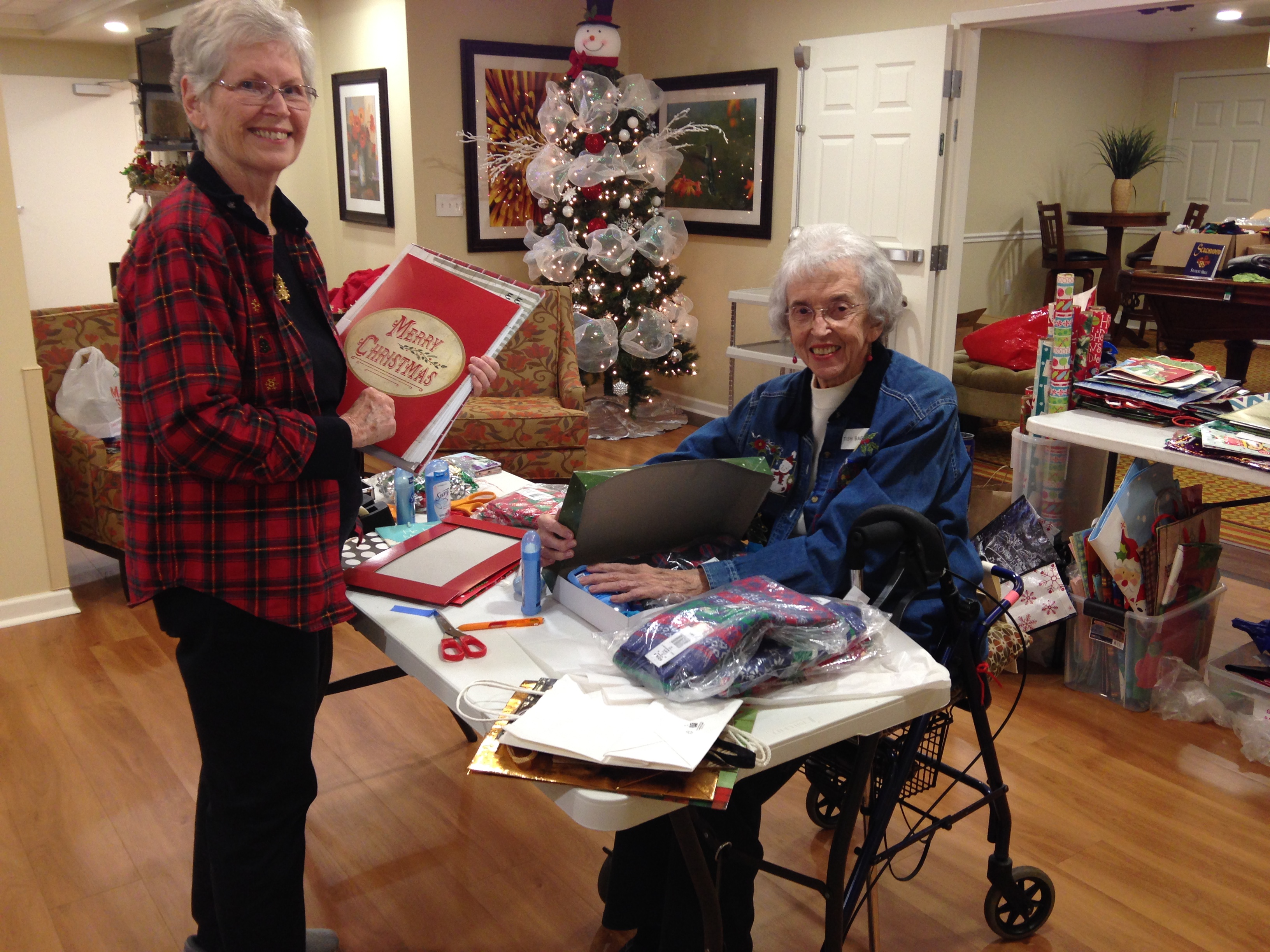 At St. Martin’s in the Pines, the Activities Director, Monica, and the Director of Fundraising, Nichole, worked diligently alongside the fifteen-plus elderly volunteers who helped decorate and wrap Christmas presents for single parents. My goodness, did these women work! Ribbons, bags, and bows were swirling around everywhere like a festive tornado. In fact, many of the residents were outperforming those of us who were a a few decades their junior. These women knew they had a mission to wrap the few hundred items that had been donated, and they tirelessly stuffed and fluffed the Christmas bags.